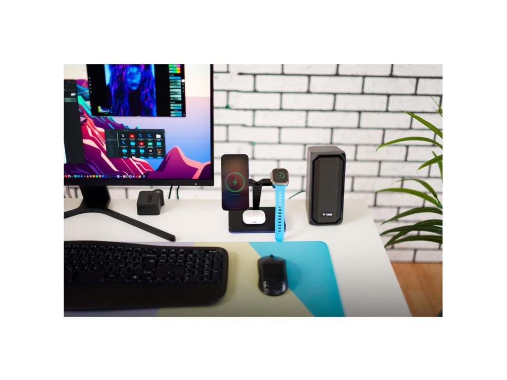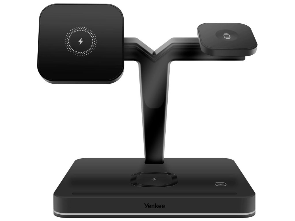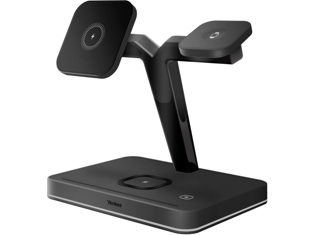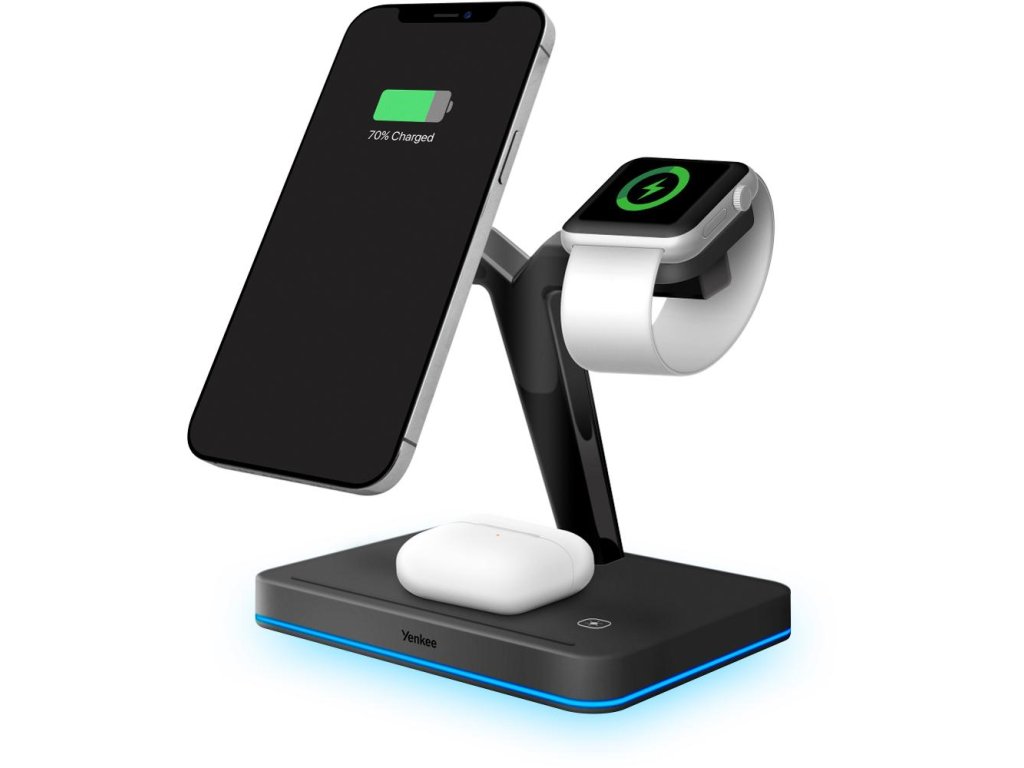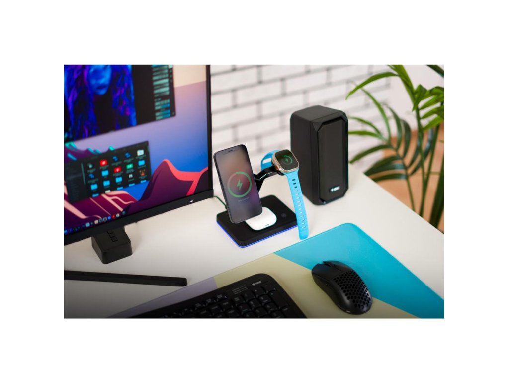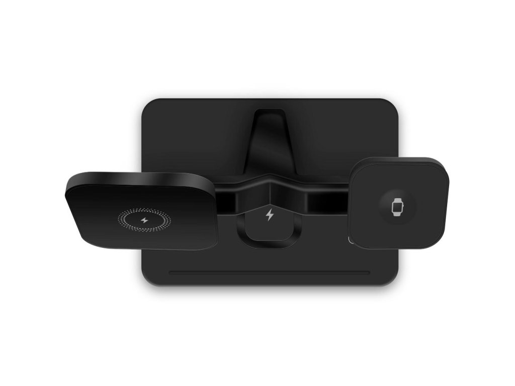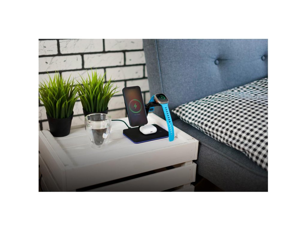 Magnetická bezdrátová nabíjecí stanice pro Apple zařízení nabíjí až tři zařízení současně (iPhone, Apple Watch, Airpods). Nabíjecí stanice je plně kompatibilní s Apple MagSafe proto je přímo určena pro iPhone řady 12 a 13 nebo novější. Telefon stačí přiblížit k nabíjecí ploše. Pomocí magnetu se telefon připevní k nabíječce a vycentruje aby bezdrátové nabíjení bylo maximálně efektivní. Airpods nebo jiná TWS sluchátka podporující bezdrátové nabíjení položte na vyznačenou plochu na podstavě nabíječky. Nabíjení se automaticky spustí, pokud je nabíjecí pouzdro správně umístěné. Apple Watch nasaďte na nabíjecí rameno přímo určené pro hodinky. Pomocí magnetu se Apple Watch spojí s nabíječkou a nabíjení se automaticky spustí. Pro dosažení správného fungování nabíjecí stanice použijte přiložený síťový adaptér s výkonem 35W. Díky elegantnímu designu nabíječka zapadne do interiéru kanceláře případně vašeho domova. O stavu nabíjení informuje LED signalizace, která svítí po obvodu nabíjecí stanice.