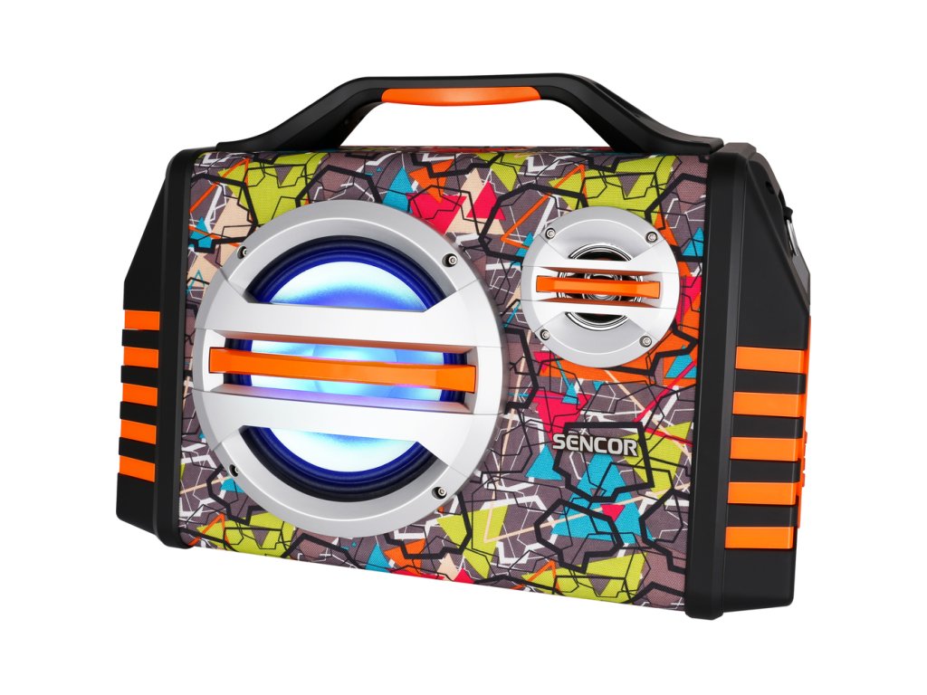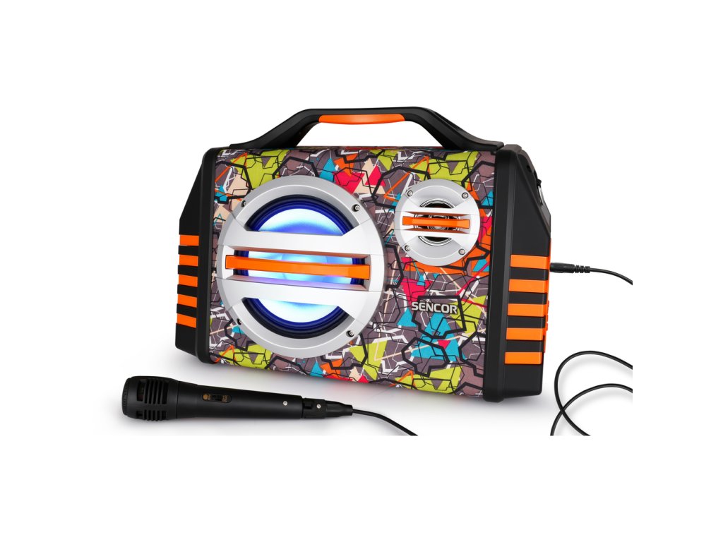 Dětský reproduktor SSS 3200 KIDS je vyvinutý na míru pro všechny děti, které mají rádi hudbu a zpěv. Je ideální řešením na dětské oslavy, dětská hřiště nebo jen tak na hraní. Díky vestavěné dobíjecí baterii o kapacitě 1800 mAh zvládne přehrávat hudbu až 5 hodin při střední úrovni hlasitosti. O kvalitní zvuk se stará jeden středový a jeden výškový reproduktor s maximálním výkonem 30 W. Svojí oblíbenou hudbu si můžete pouštět pomocí bezdrátového rozhraní Bluetooth s dosahem až 15 metrů, z USB klíčenky, harddisku, SD karty nebo z jiného zařízení pomocí 3,5 mm konektoru Jack. Reproduktor je osvětlen vícebarevnou LED diodou pro navození té správné atmosféry. Právě přehrávanou hudbu z AUX vstupu nebo FM rádia a zpěv, lze zaznamenat na médium připojené k zařízení. Balení obsahuje drátový mikrofon, popruh na přenášení a 3,5mm Jack kabel.