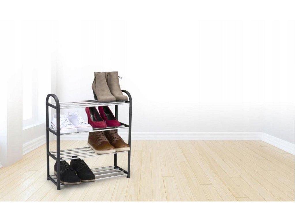 Kompaktní 4-patrový stojan na boty Alpina (50 × 18,5 × 57 cm), snadná montáž bez nářadí, pro až 8 párů obuvi. Elegantní černo-stříbrný design pro předsíň i malý prostor.