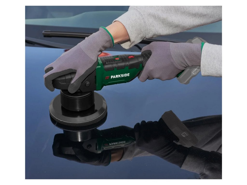 Výkonná akumulátorová orbitální leštička Parkside PPMA 20-Li C3 s regulací otáček, průměrem kotouče 150 mm a ergonomickým držadlem. Ideální pro leštění a voskování karoserií. Bez akumulátoru a nabíječky.