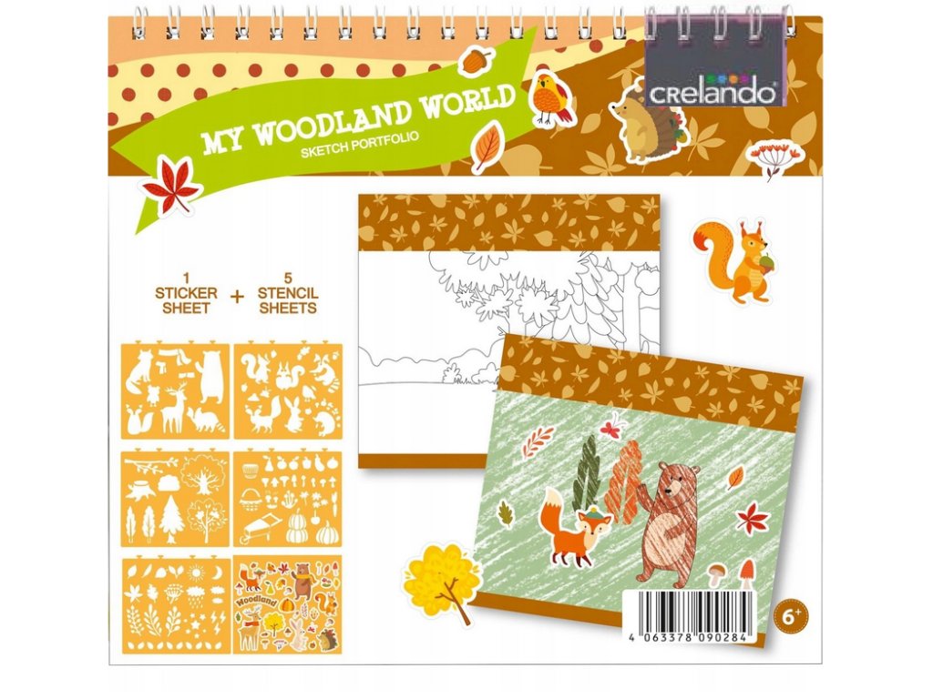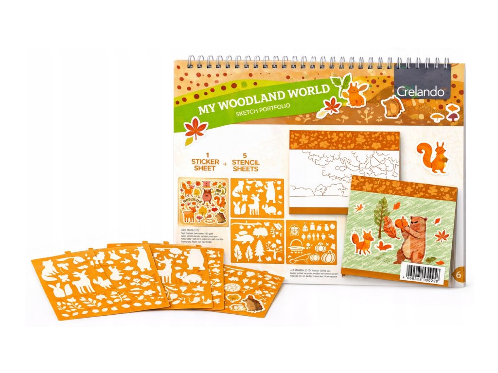 Crelando - kreativní výtvarná sada pro děti, inspirovaná lesním světem a přírodou. Ideální pro kreslení, obkreslování a vytváření vlastních ilustrací pomocí šablon a samolepek.