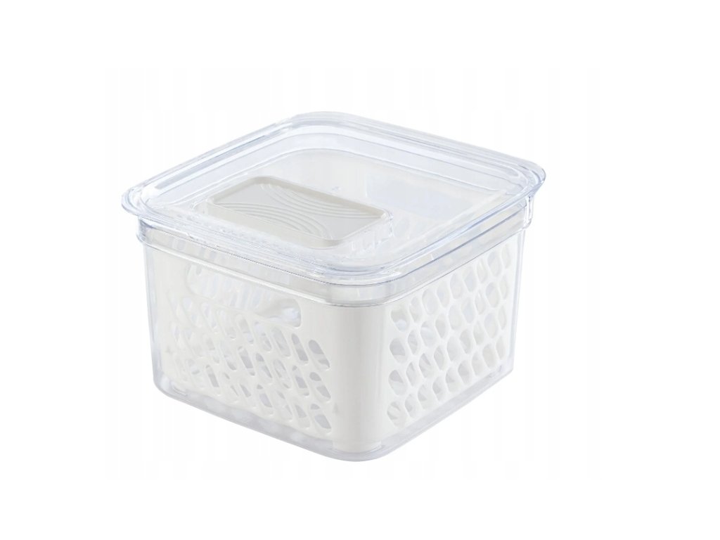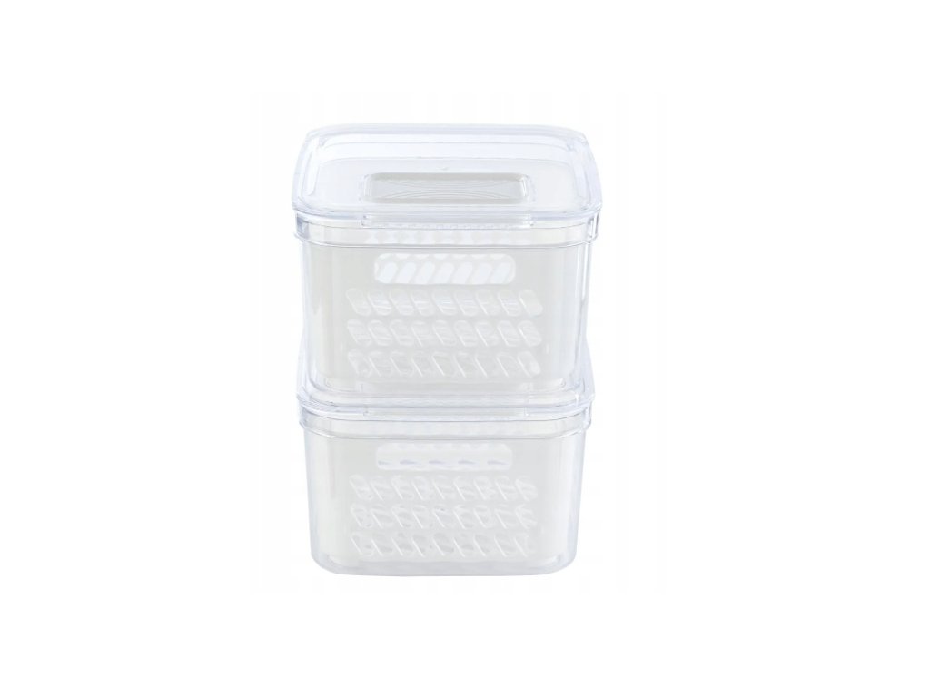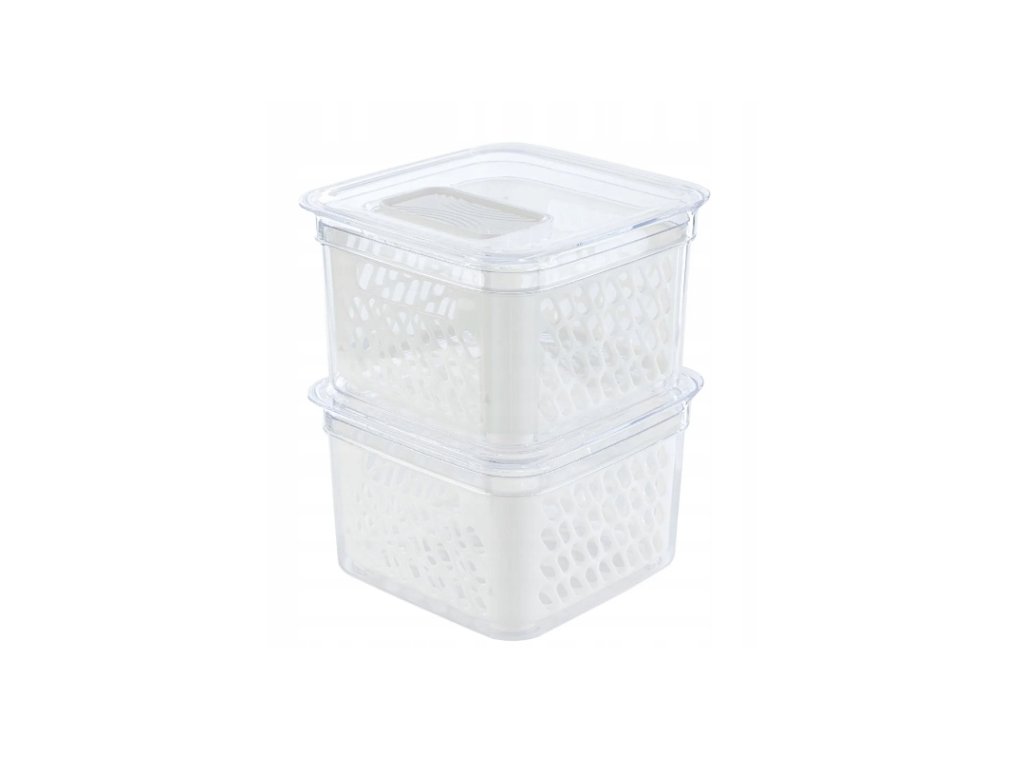 Livarno Home sada 2 nádoby na potraviny (2× 1,8 l) s odkapávací vložkou. Víčka s posuvným uzávěrem, plast odolný 0-45 °C, vhodné do myčky. Udržují ovoce a zeleninu svěží bez stojící vody.