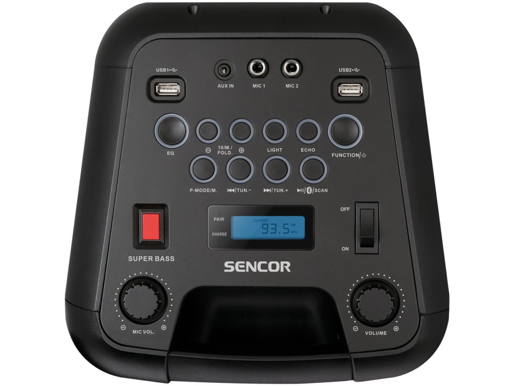 Reproduktor SSS 3800 ozvučí menší i větší párty dle vašich představ. Díky vestavěné dobíjecí baterii o kapacitě 4000 mAh zvládne přehrávat hudbu až 10 hodin při střední úrovni hlasitosti. O kvalitní stereo zvuk se starají 2 středové a 2 výškové reproduktory s maximálním výkonem 60 W. Svojí oblíbenou hudbu si můžete pouštět pomocí bezdrátového rozhraní Bluetooth s dosahem až 20 metrů, z USB klíčenky, harddisku nebo z jiného zařízení pomocí 3,5mm konektoru Jack. Reproduktory jsou osvětlené LED diodami v 7 barvách pro navození té správné atmosféry, k dispozici je 5 módů. Balení obsahuje drátový mikrofon.