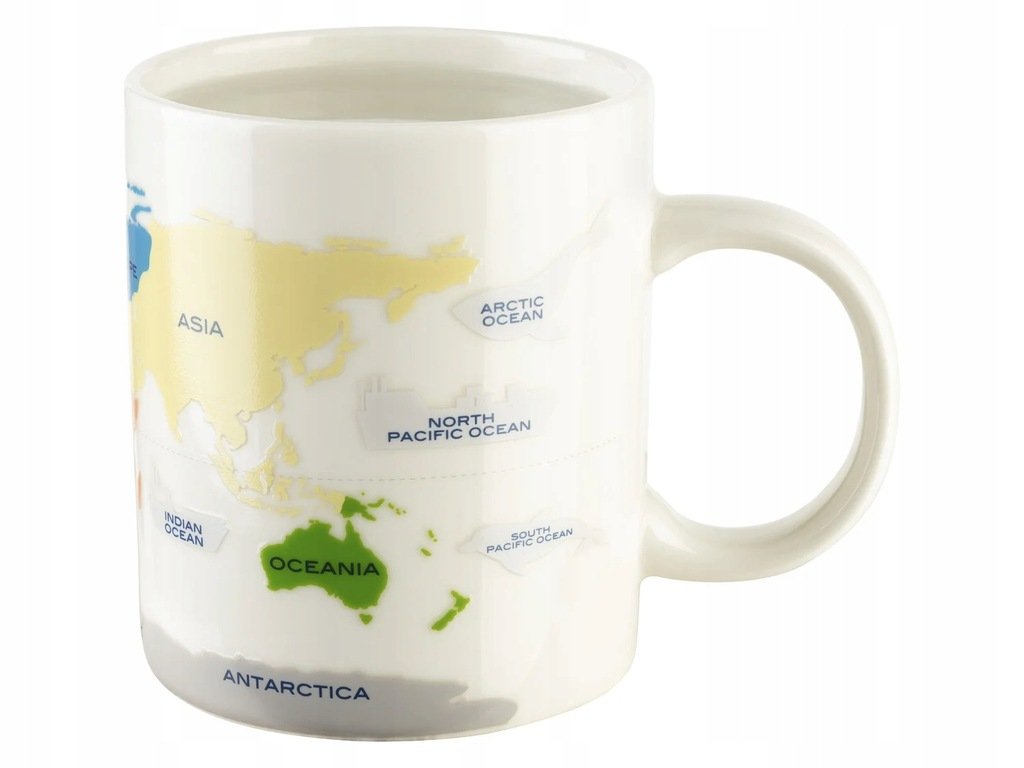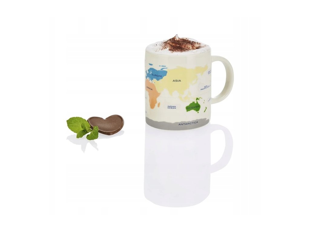 Porcelánový hrnek Ernesto „Mapa světa“, který při nalití horkého nápoje změní motiv — praktický a dekorativní doplněk pro milovníky kávy či čaje.