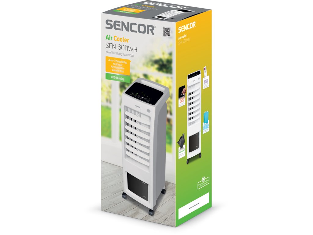 Ochlazovač vzduchu SENCOR SFN 6011WH 3v1 kombinuje funkce ochlazovače, zvlhčovače a ventilátoru. Nabízí 3 rychlosti, 3 režimy, dálkové ovládání, časovač a 6l nádržku na vodu.