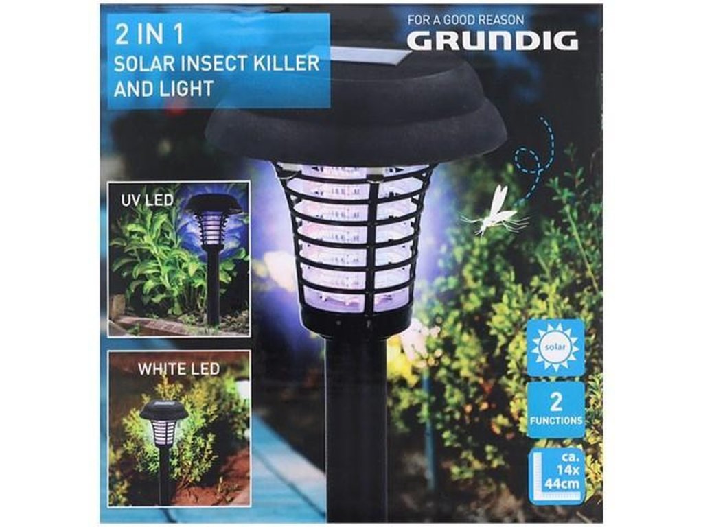Solární lampa Grundig 2v1 kombinuje LED osvětlení a UV světlo pro odstraňování hmyzu. Ideální pro osvětlení zahrady a ochranu proti komárům.