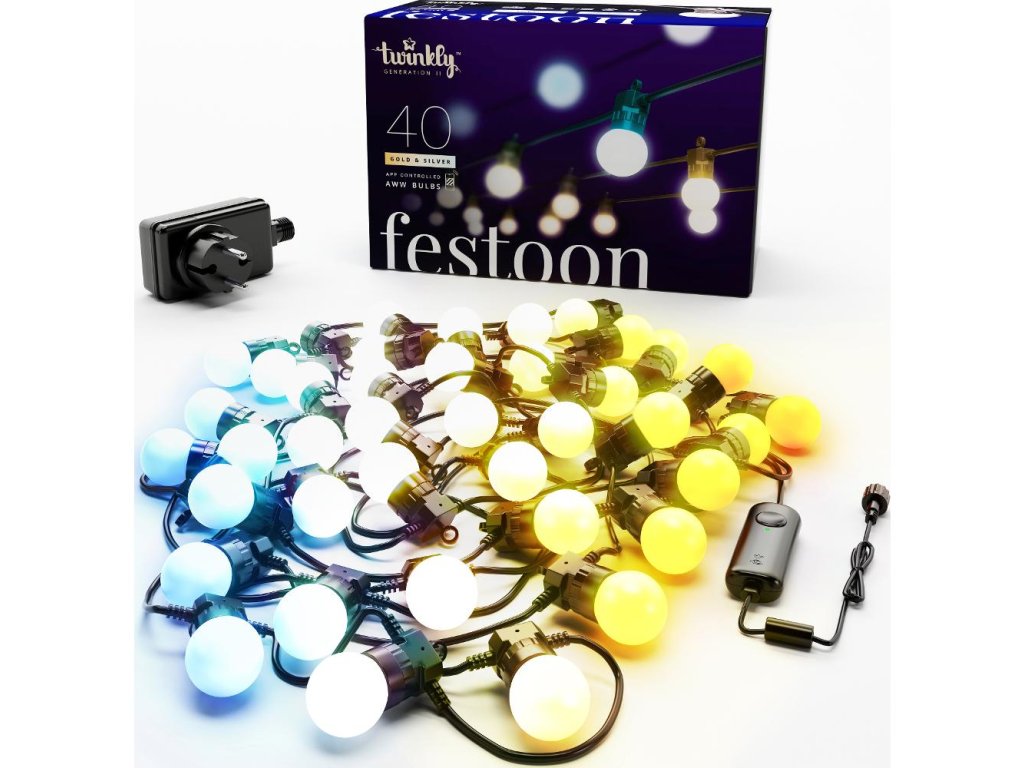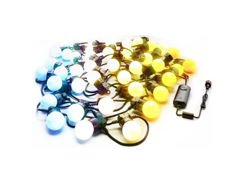 Inteligentní venkovní LED řetěz s 40 AWW žárovkami, ovládání přes aplikaci, kompatibilní s Alexa, Google Assistant a Apple HomeKit.