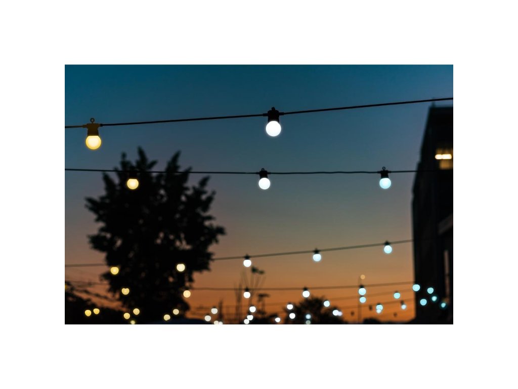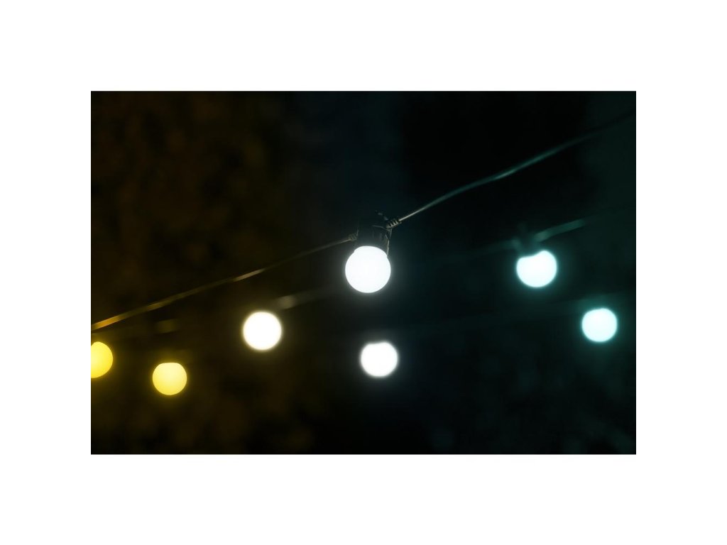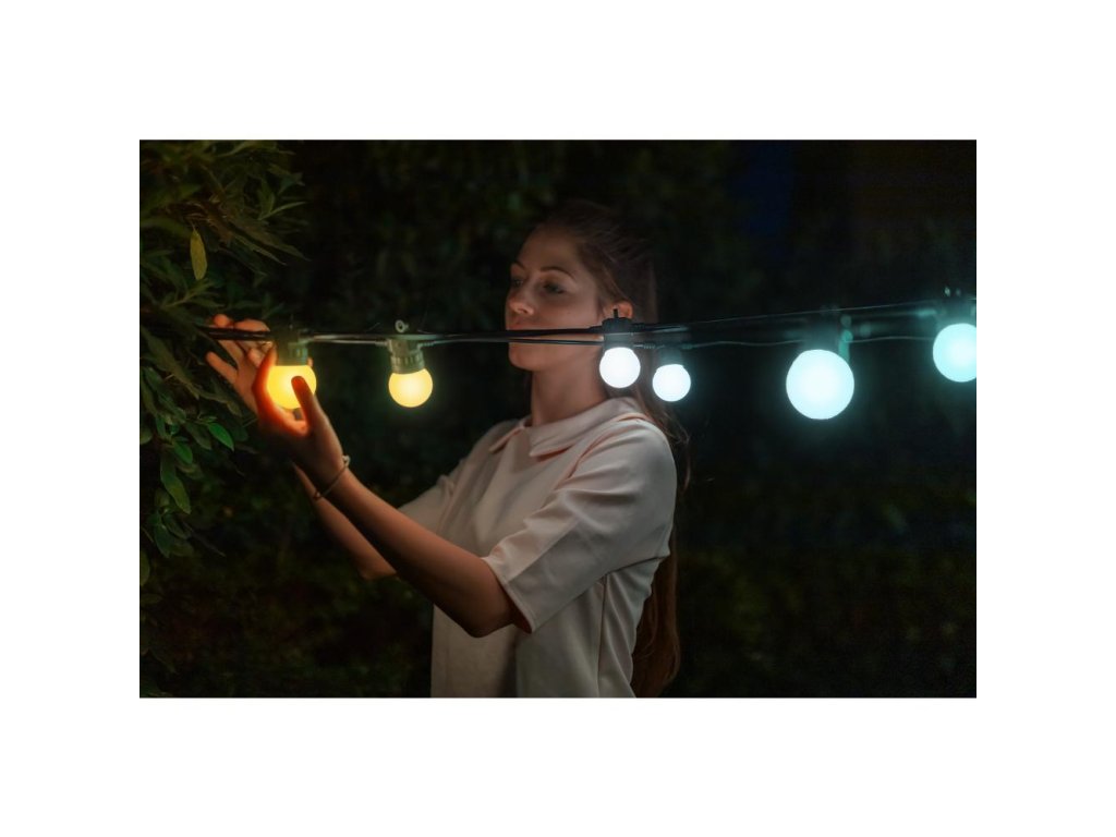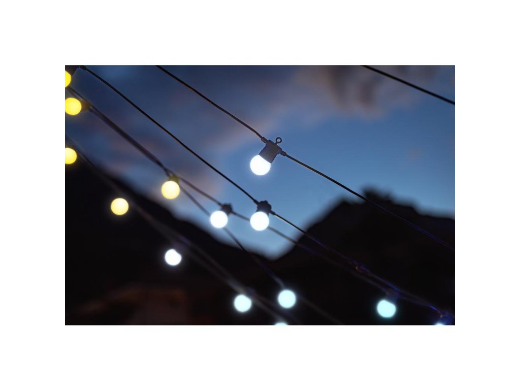 Twinkly TWF040GOP-BEU je inteligentní venkovní LED řetěz s 40 AWW (Amber, Warm White, Cold White) žárovkami typu G45, ideální pro vytvoření atmosférického osvětlení na terasách, zahradách nebo během večerních akcí. Díky délce 20 metrů a černému kabelu se hodí do různých venkovních prostor.