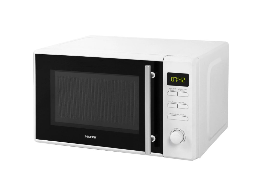 Kompaktní mikrovlnná trouba Sencor SMW 4220WH s objemem 20 l, výkonem 700 W a grilem 1000 W. Snadné mechanické ovládání a klasický bílý design.