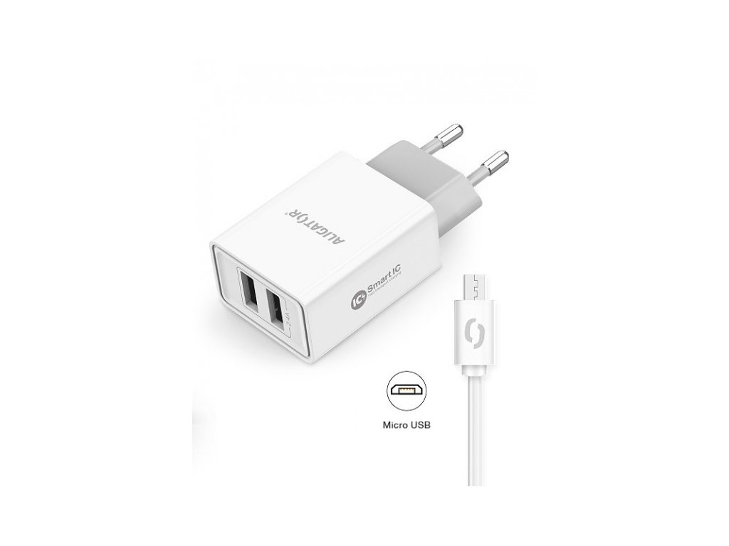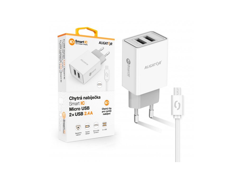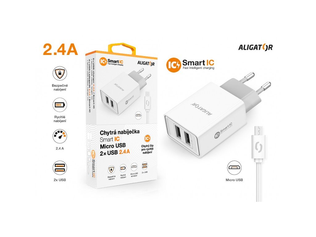 Chytrá síťová nabíječka ALIGATOR 2.4A, 2xUSB, smart IC, bílá, Micro USB kabel 2A