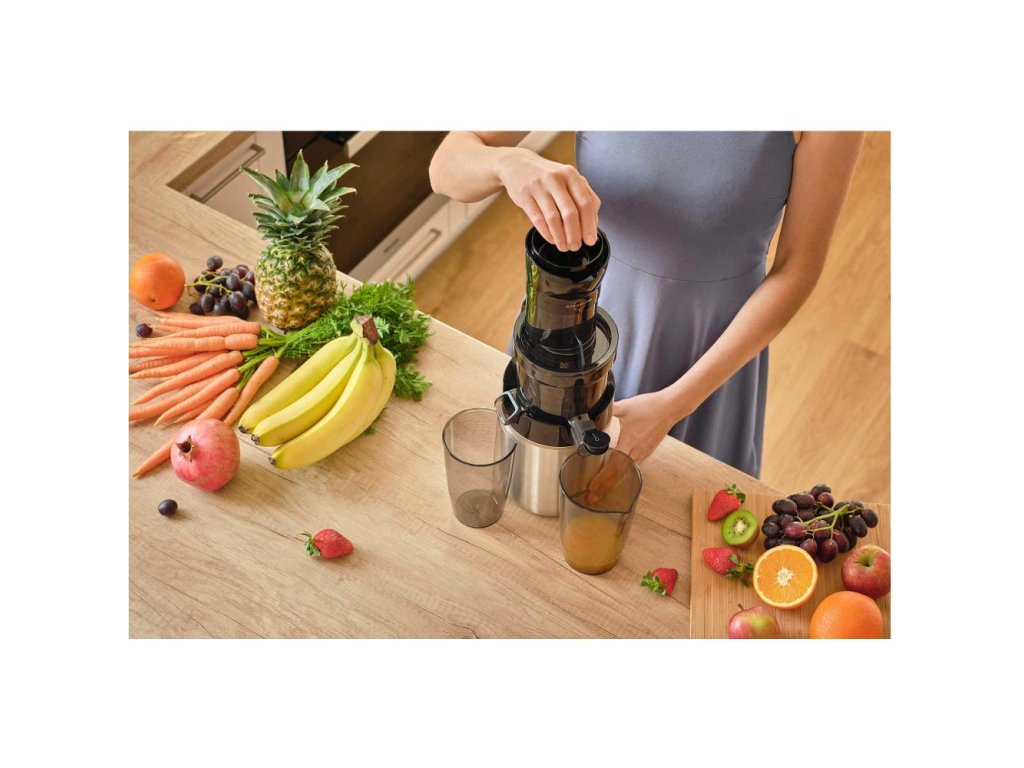- Nerezové tělo a široký podávací otvor (78 mm) pro pohodlné vkládání ovoce a zeleniny