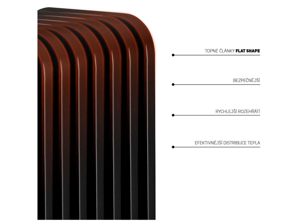 • Vylepšená konstrukce topných článků / žeber FLAT SHAPE pro rychlejší rozehřátí, lepší předávání tepelné energie do vyhřívaného prostoru a větší bezpečnost