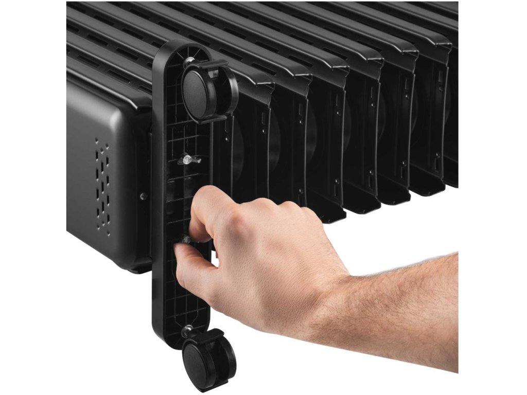 • čelní držák na předním panelu pro bezpečné uložení přívodního kabelu spolu s pohodlným madlem a stabilní zakládnou dvou nožek s kolečky jsou zárukou snadné manipulace s olejovým radiátorem (topení přesouvejte vždy jen vypnuté se smotaným napájecím kabelem a vychladlé)