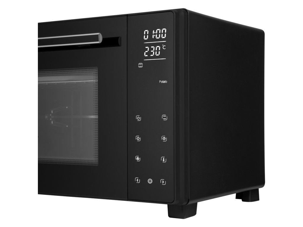 Volně stojící elektrická trouba Sencor SEO 3250BK nabízí objem 35 litrů a výkon 1700 W. Díky dotykovému ovládání a 9 přednastaveným programům (např. pizza, gril, kuře, rozmrazování) je ideální pro každodenní vaření. Trouba disponuje teplotním rozsahem 30–230 °C, 150minutovým časovačem s automatickým vypnutím a zvukovým signálem. Vnitřní osvětlení, dvojité prosklení a chladný dotykový povrch zajišťují bezpečnost a pohodlí při používání. Součástí balení jsou nepřilnavý plech, pochromovaný rošt, otočný rožeň a držáky pro snadné vyjmutí příslušenství.