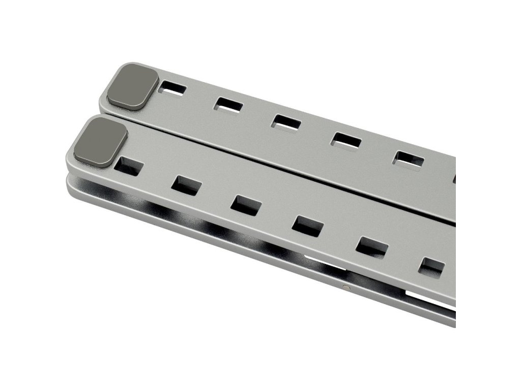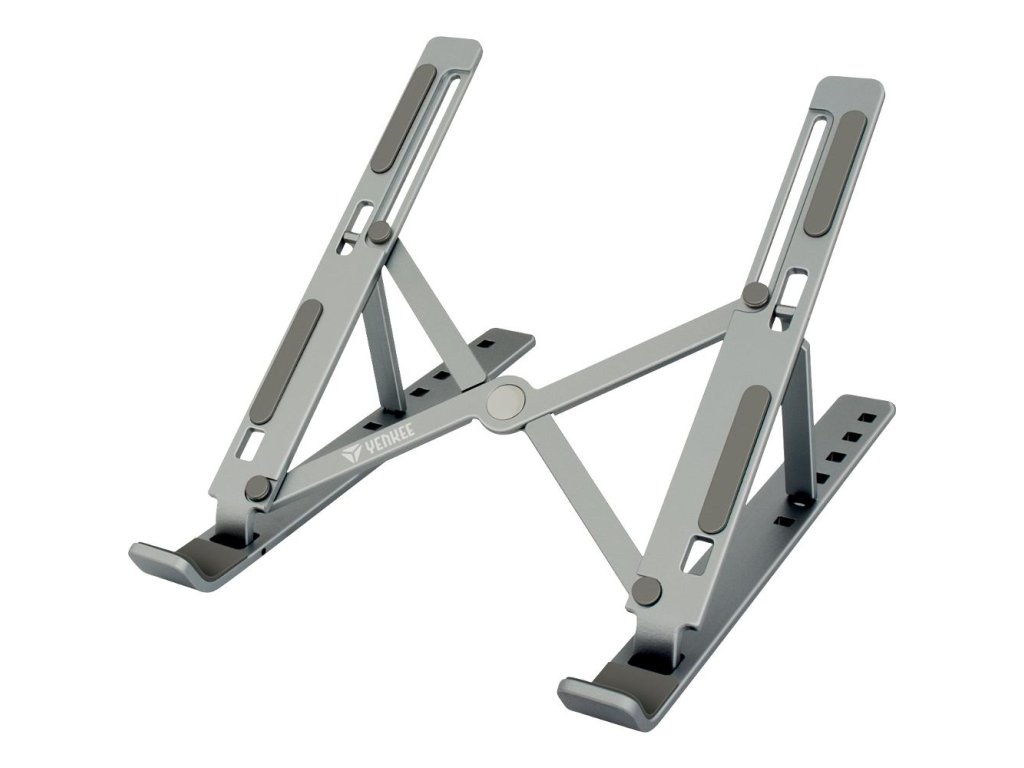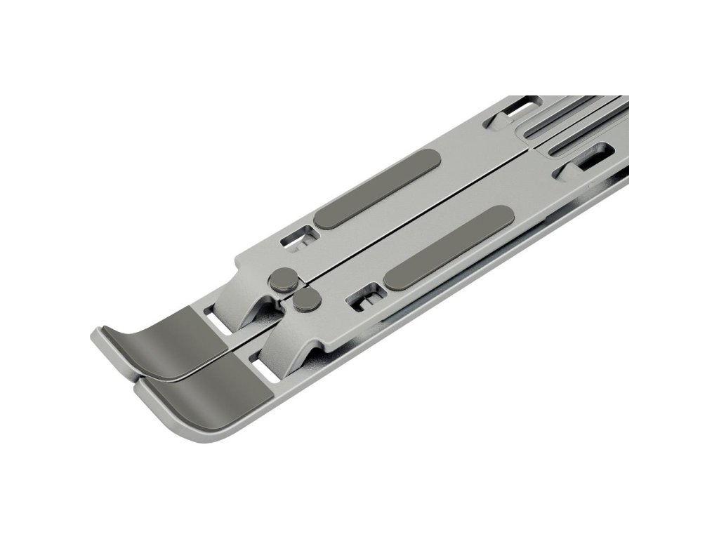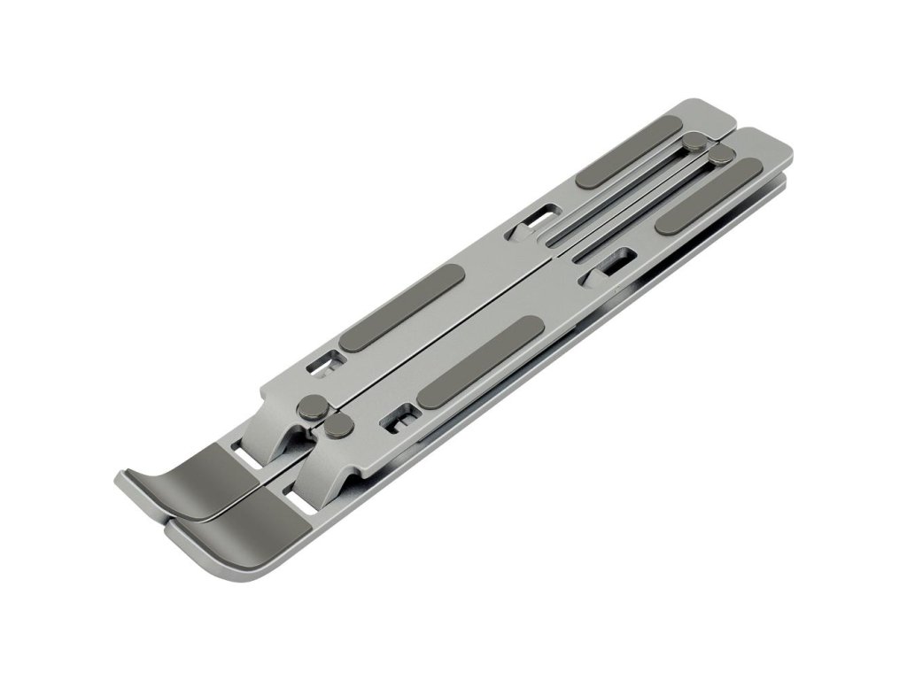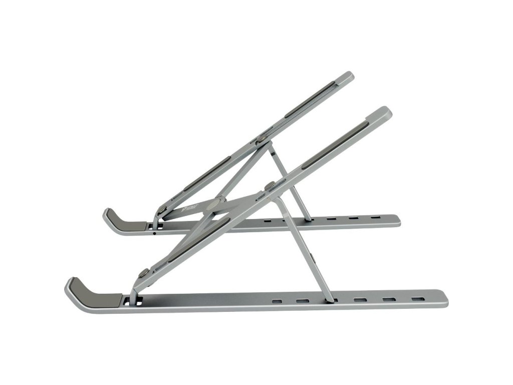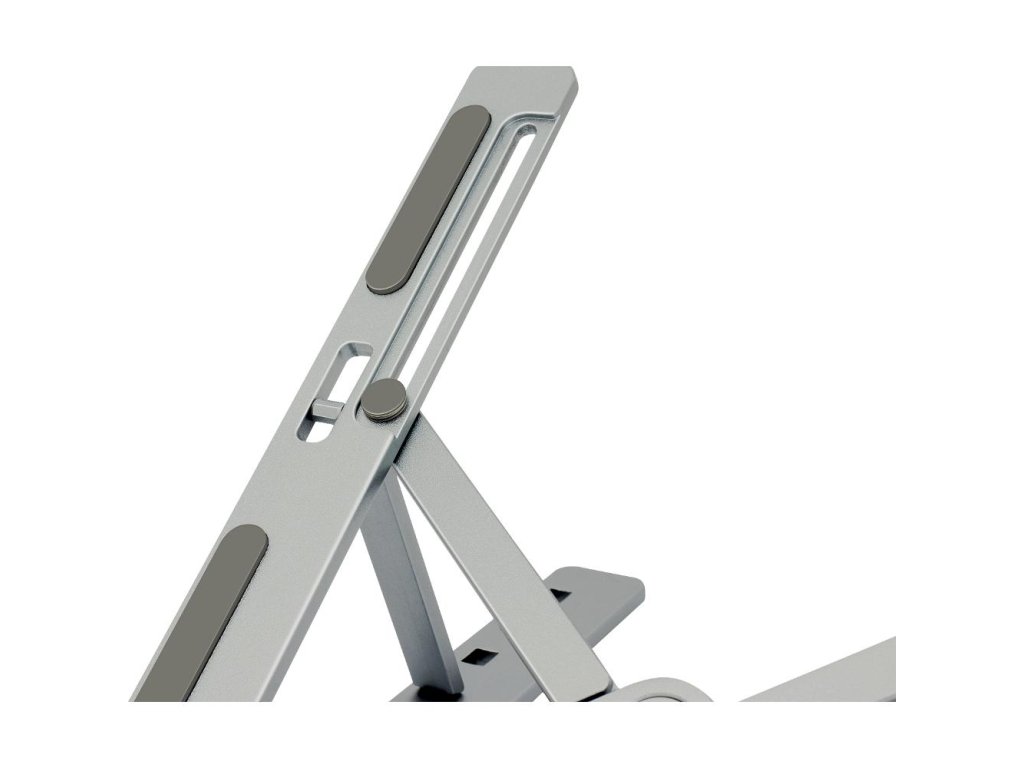 Přenosný kovový stojan pro tablety a notebooky do velikosti až 15.6"" umožňuje nastavení až 6 různých pohledových úhlů. Jednoduchý způsob složení umožňuje vzít držák sebou do kanceláře, domů nebo na cesty. Součástí balení je látkový pytlík pro lepší přesnost držáku. Protiskluzové prvky zajišťují stabilitu při práci a ochranu proti poškrábání vašeho zařízení. Možnost nastavení až 6 pohledových úhlů podporuje lepší ergonomii těla při práci. Notebook využijete jako stolní počítač. Konstrukce držáku zlepšuje chlazení vašeho notebooku při práci.
