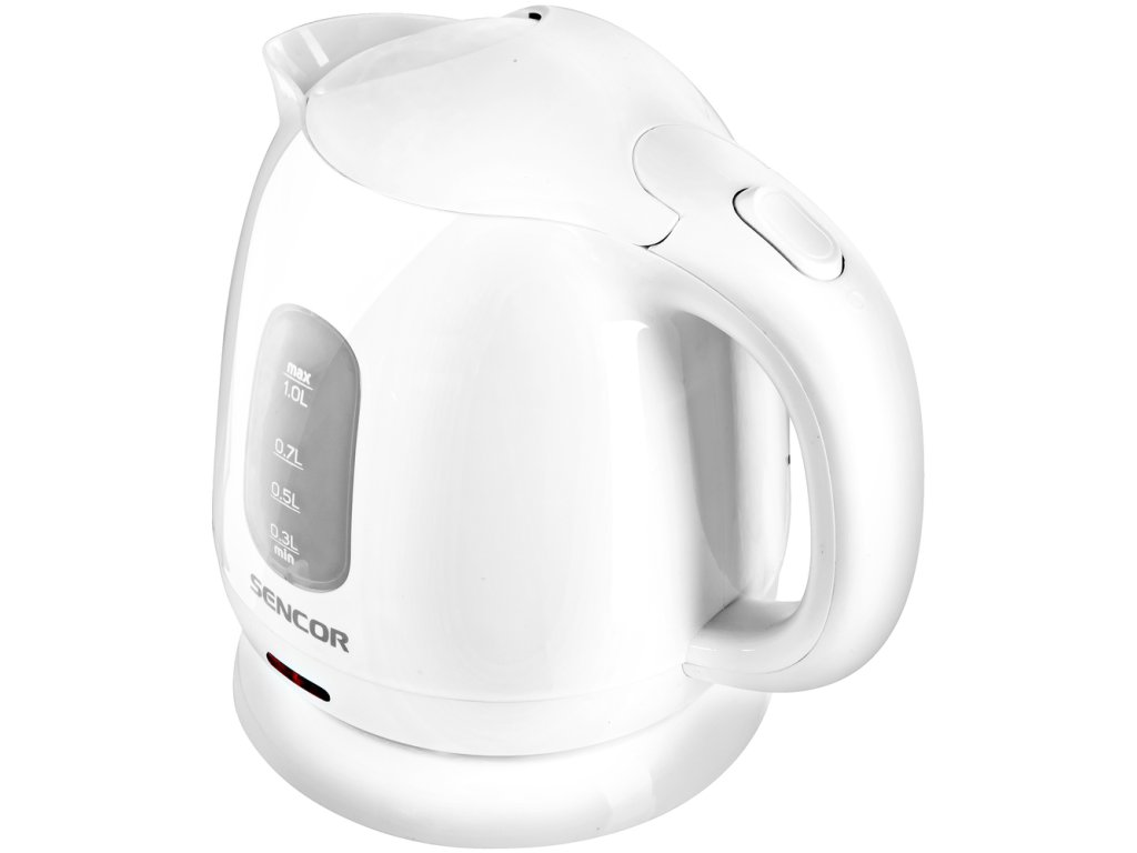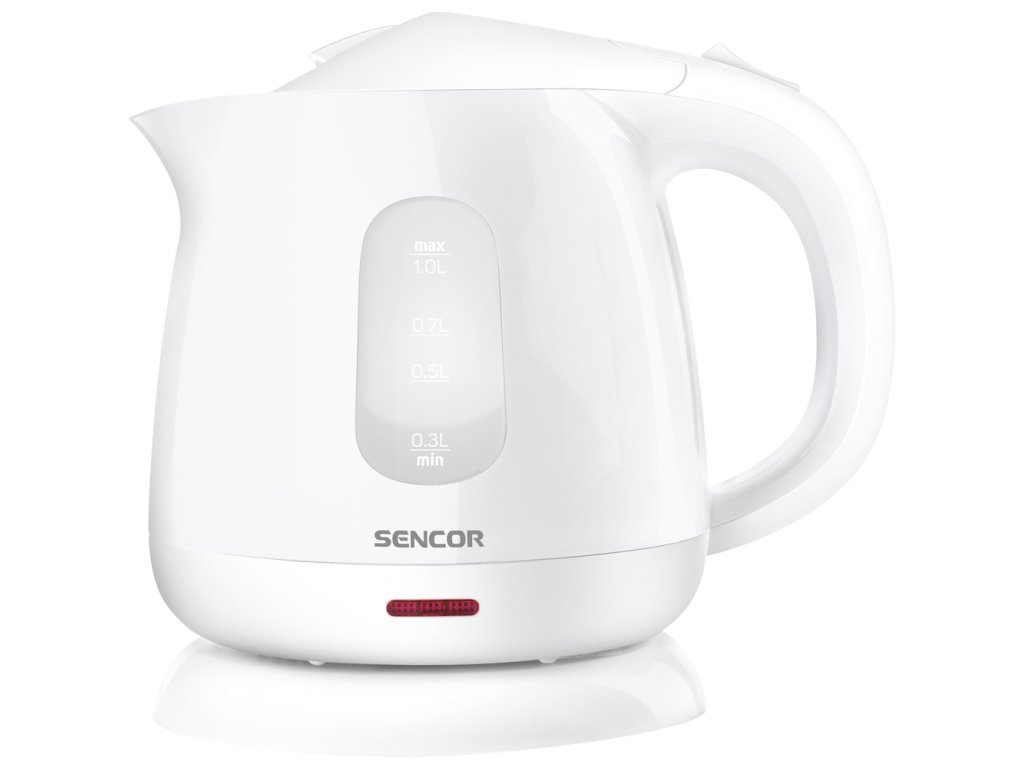 Kompaktní 1 l konvice Sencor SWK 1101BK s příkonem 1 100 W – skrytá spirála, oboustranný vodoznak, bezpečnostní aretační víko, filtr a 360° podstavec.