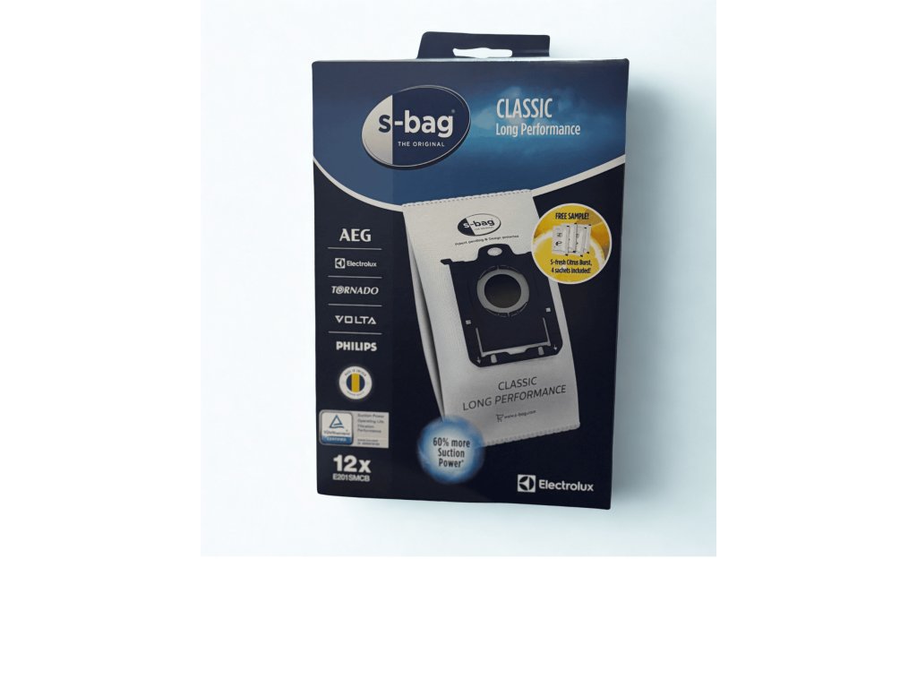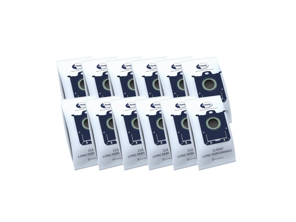 Balení 12 syntetických sáčků S-bag Classic Long Performance — dlouhodobá výkonnost, vysoká filtrace a kompatibilita s mnoha modely vysavačů značek Electrolux a Philips.