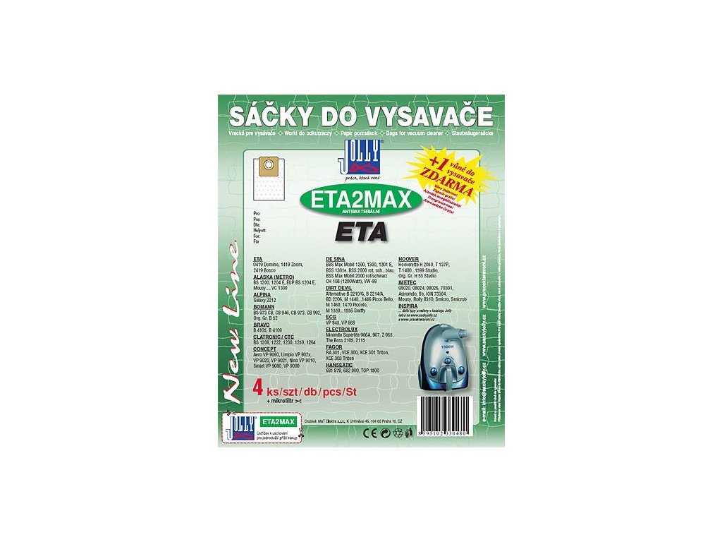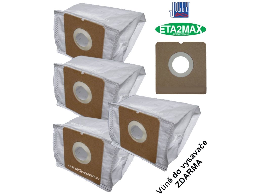 Sáčky ETA2 MAX Jolly textilní filtrační sáčky jsou vyrobeny z vícevrstvé netkané textílie v antibakteriálním provedení, které jsou vhodné pro sáčkový vysavač ETA Domino, Zoom, Bosco nebo SENCOR SVC 45 a SENCOR SVC 52 a pro další vysavače jiných výrobců BRAVO, CLATRONIC, CONCEPT, GORENJE, HYUNDAI...