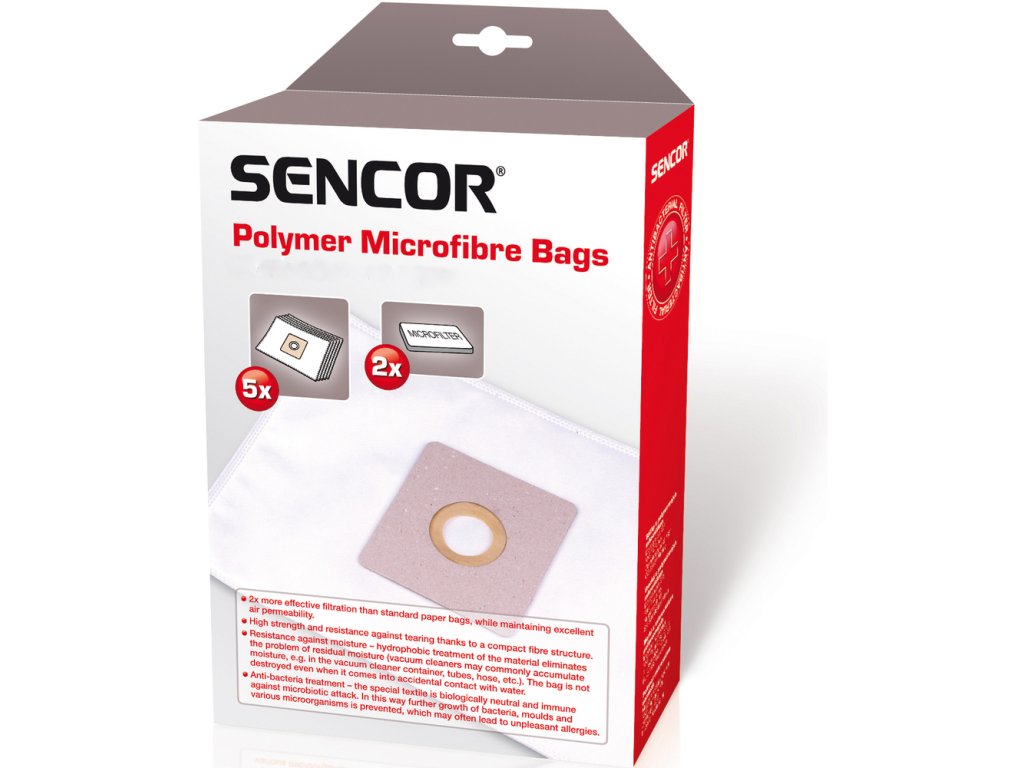 Balení 5 mikrovlákenných sáčků Sencor SVCX 0850 (3 l) – 2× lepší filtrace, hygienický uzávěr, odolné proti vlhkosti, antibakteriální pro modely SVC 55/60/83/85/93.