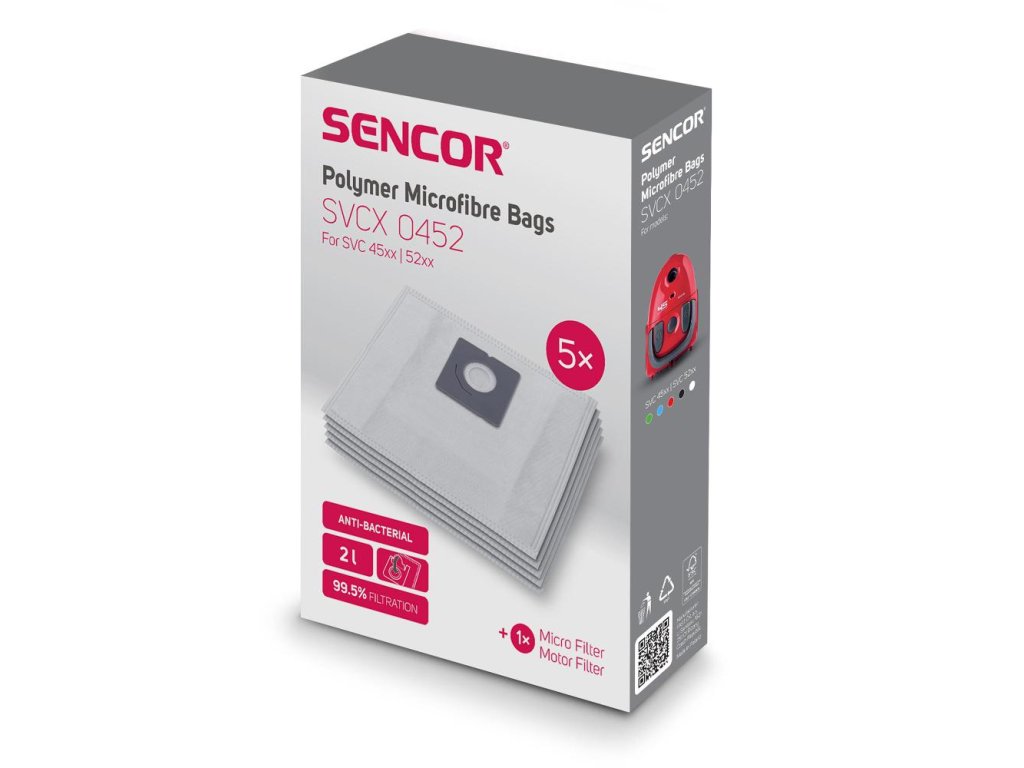 Originální mikrovlákenné sáčky SVCX 0452 pro vysavače Sencor SVC 45/52 – 5 ks + 2 mikrofiltry, filtrace na úrovni HEPA, hydrofobní a antibakteriální úprava.