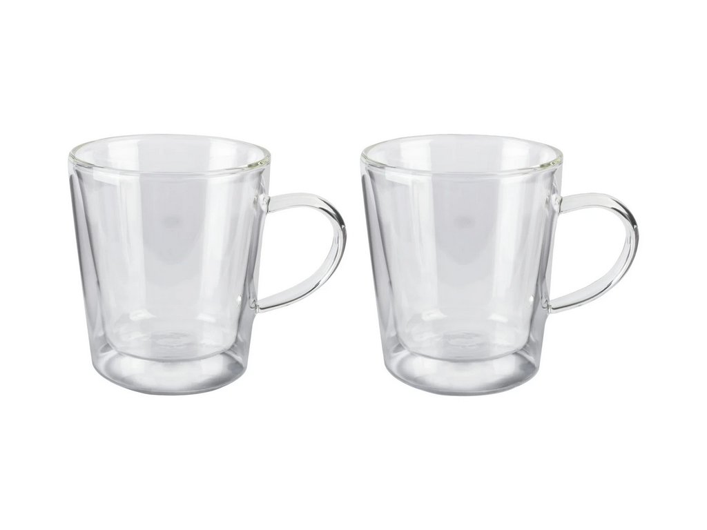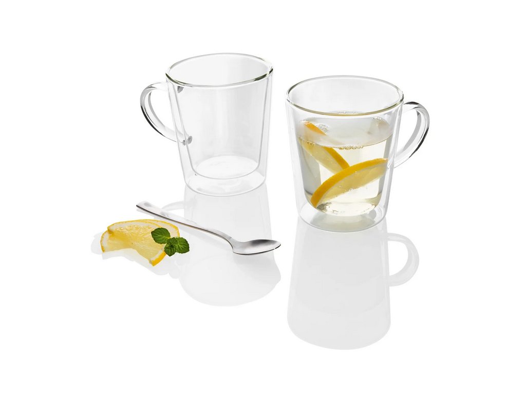 Sada 2 termo sklenic LIVARNO home z dvojitého borosilikátového skla – udrží nápoje horké i ledové, vhodné do mikrovlnky i myčky, odolné od 4 °C do 100 °C.