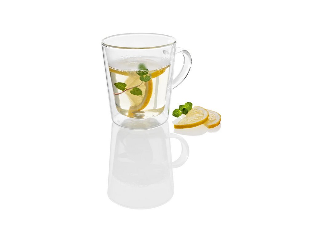 - Materiál: borosilikátové dvojité sklo — lehké, čiré a odolné vůči teplotním šokům.