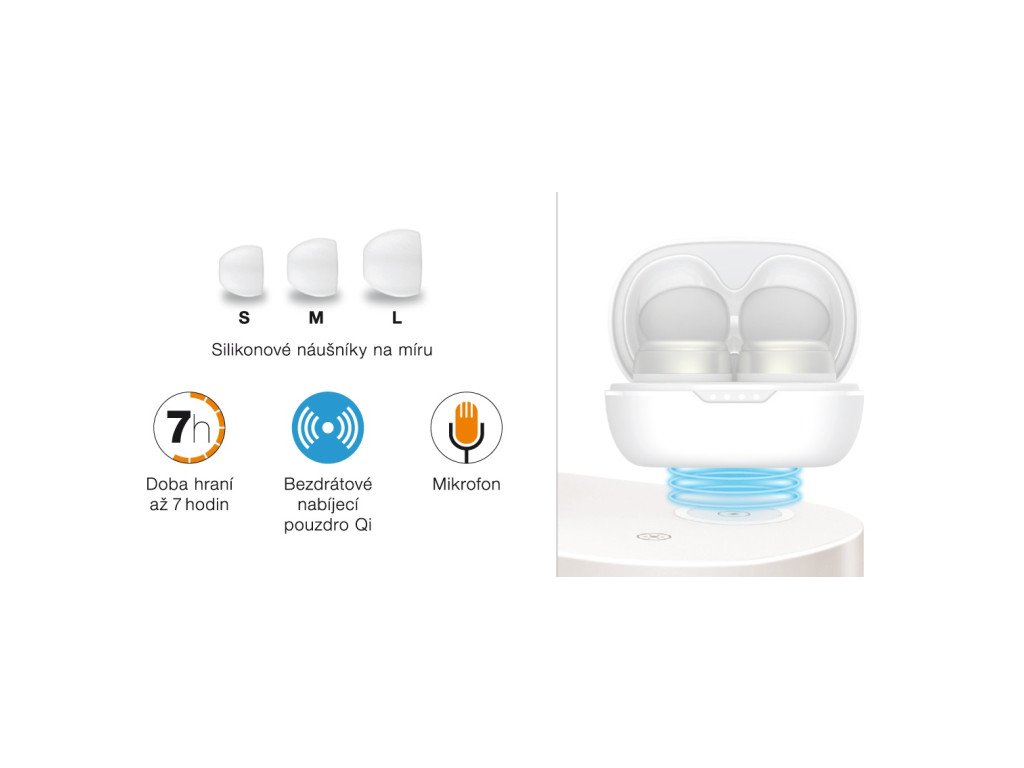 - Kapacity baterií: 50mAh (sluchátka) 320mAh (dobíjecí pouzdro)
