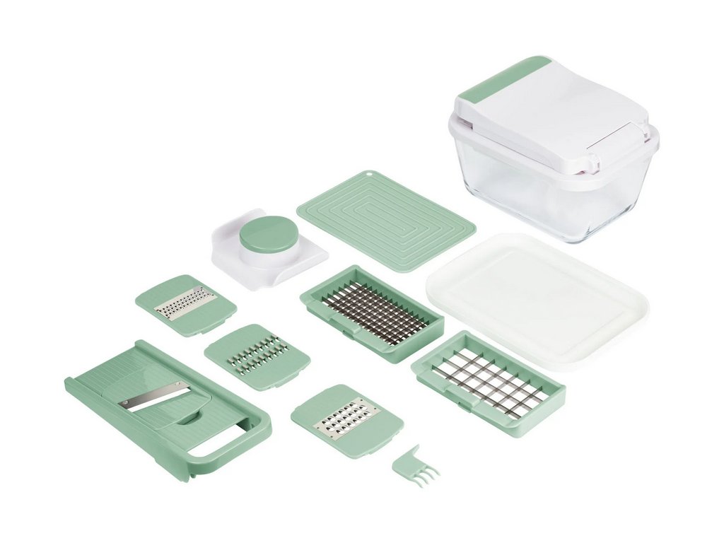 Všestranný kuchyňský kráječ Ernesto s 6 vyměnitelnými nástavci pro přesné krájení, plátkování, strouhání. Praktický pomocník pro všechno ovoce, zeleninu a syr.