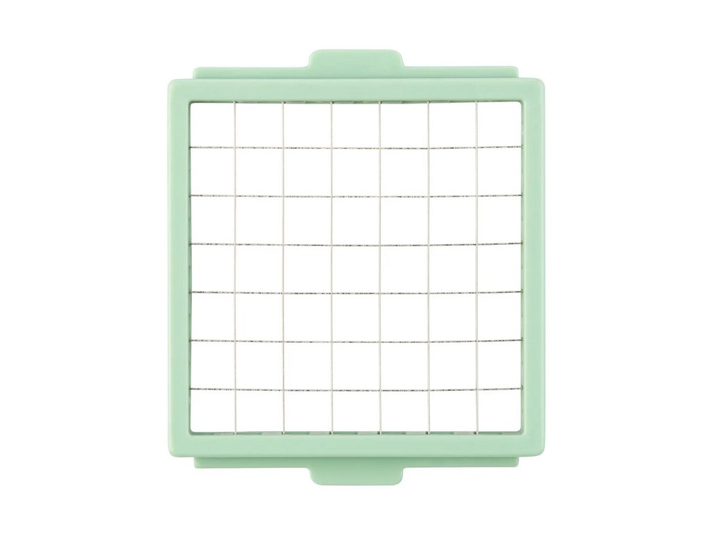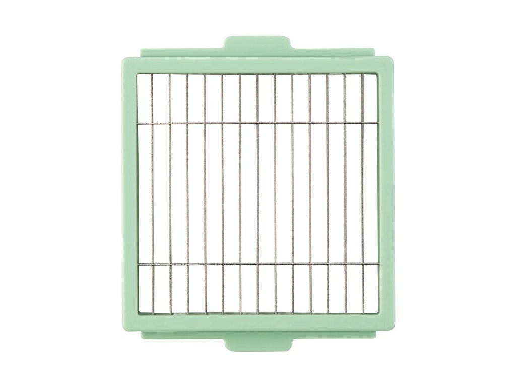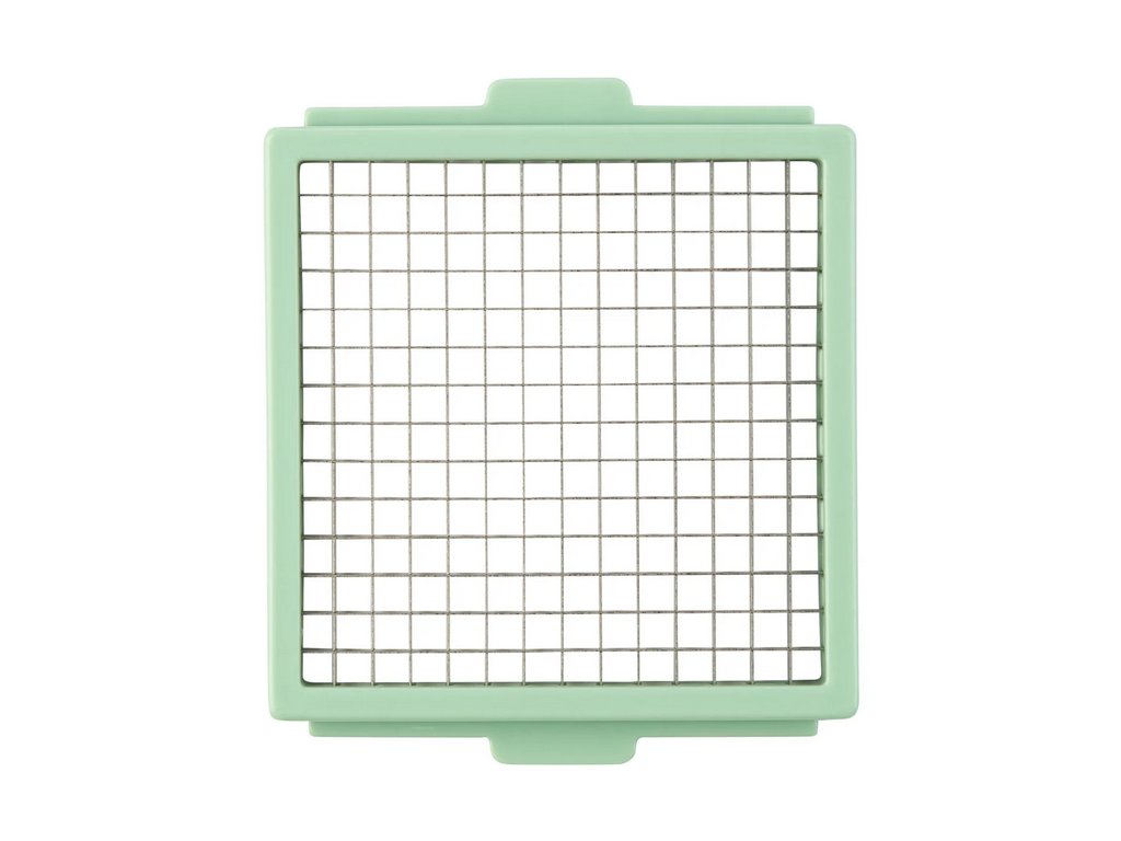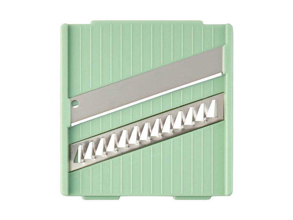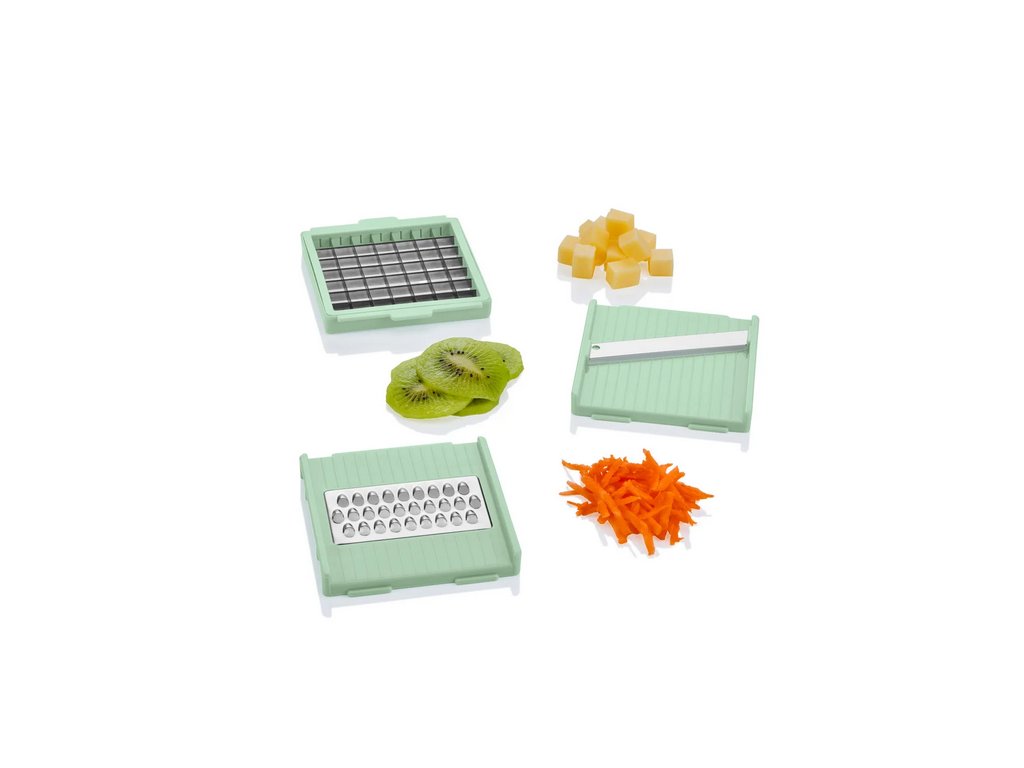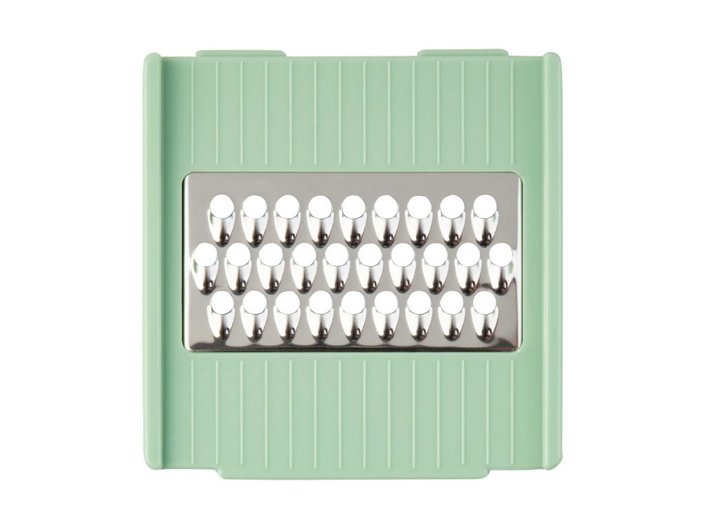 - Se 6 vložkami: 2 plotýnky (hrubá a jemná), 2 krájecí mřížky (velká a malá), rašple a vložka Julienne