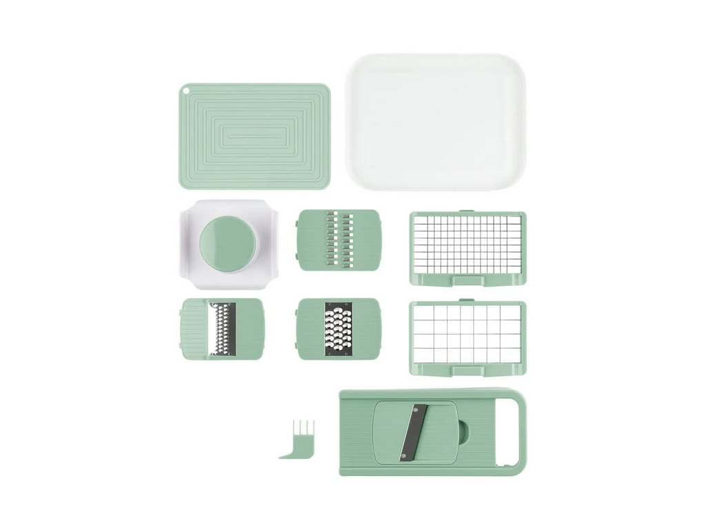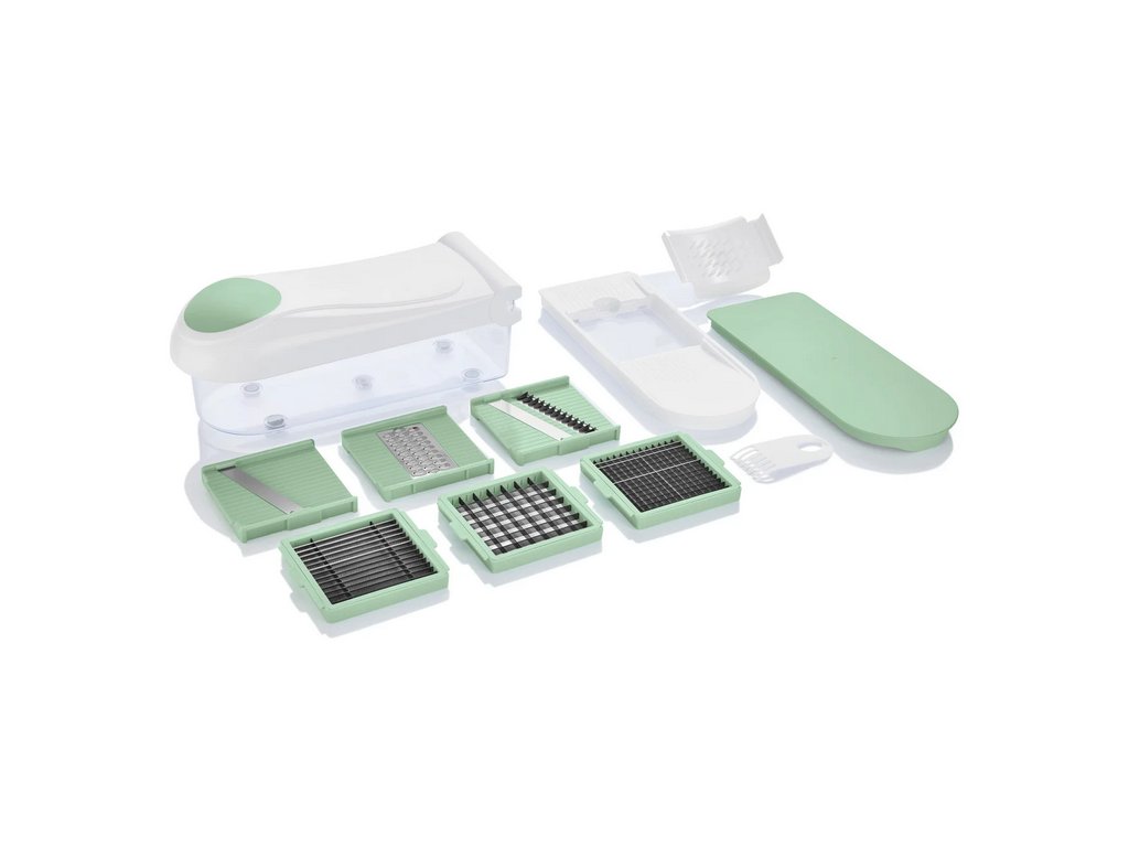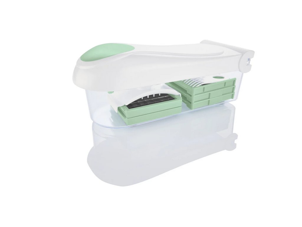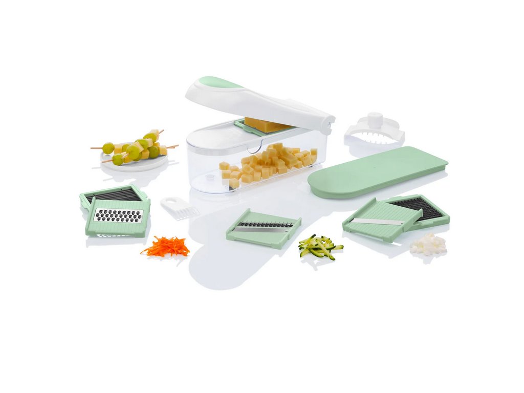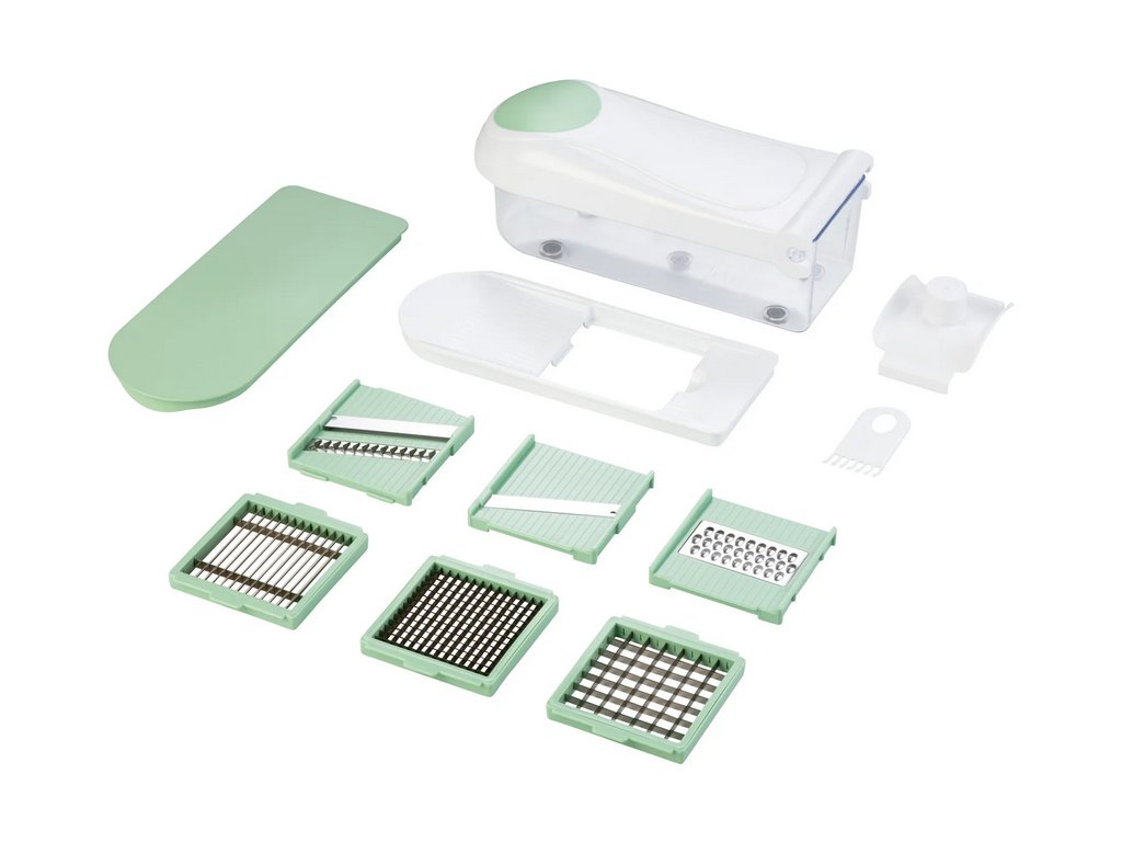 Univerzální manuální kráječ s nádobou a 6 výměnnými nástavci — plátky, kostky, Julienne, hrubé i jemné strouhání. Bez BPA, ostré nerezové břity, bezpečný držák zbytků a protiskluzové podložky.