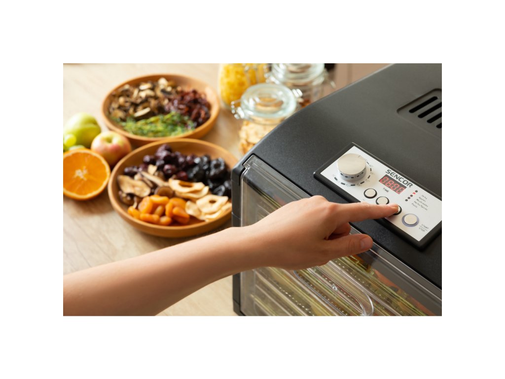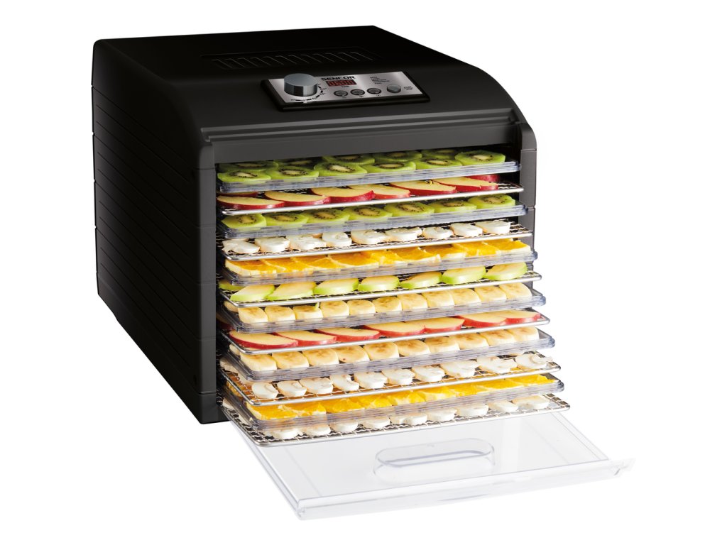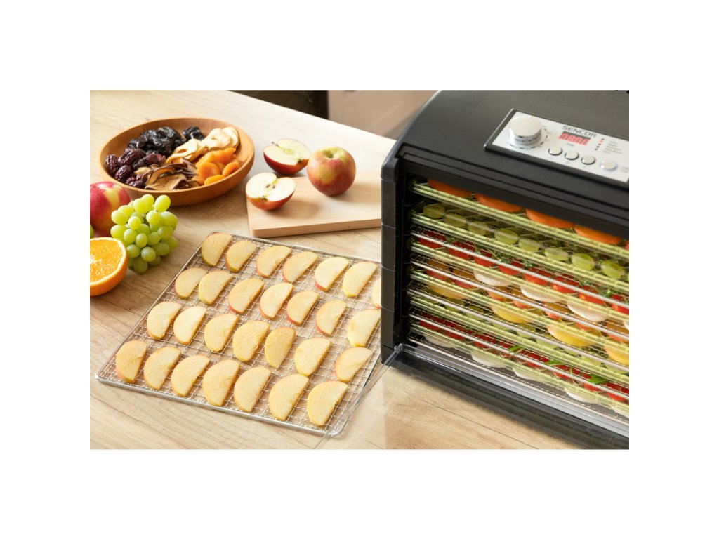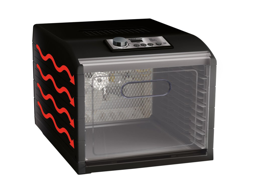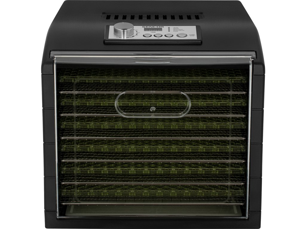Průhledná dvířka a podnosy umožňují okamžitou vizuální kontrolu nad stavem sušení