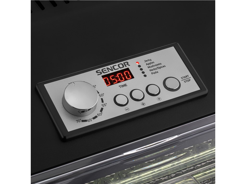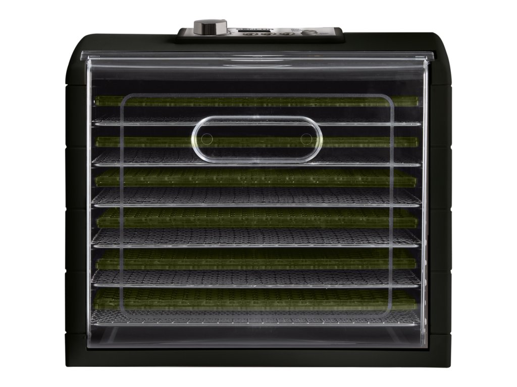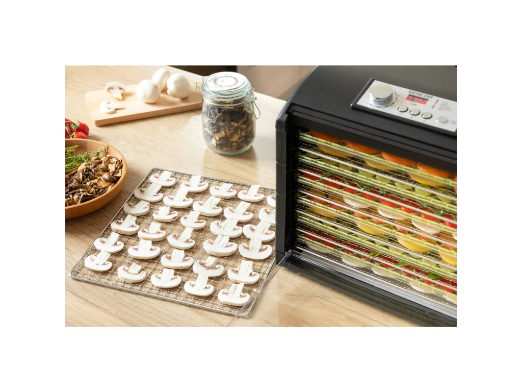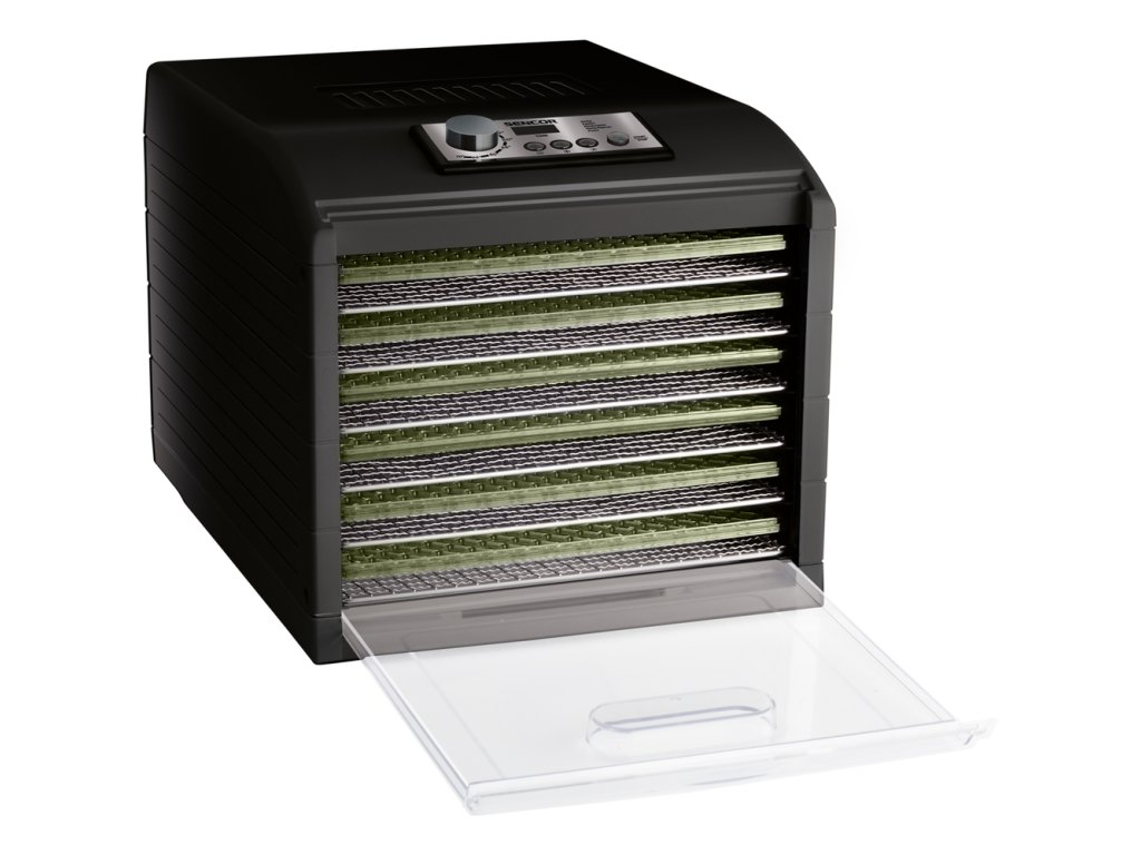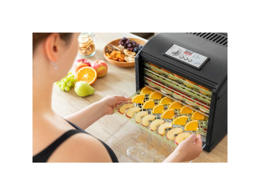 Průhledná dvířka a podnosy umožňují okamžitou vizuální kontrolu nad stavem sušení