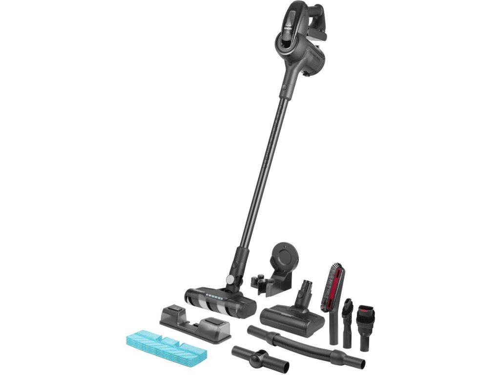 Tyčový vysavač Sencor SVC 8726BK 4 v 1 s mopem a odnímatelnou ruční jednotkou. Digitální 400W motor a rotační kartáč s vlastním motorem zaručují vynikající výsledky na jakémkoli typu podlahs leštícím efektem na tvrdých podlahách. Díky vysoce účinné 25,2V Li-Ion baterii s kapacitou 2 500 mAh dokáže pracovat až 50 min na jedno nabití. 3 stupně výkonu - turbo, vysoký výkon a denní úklid. Prostor úklidu je osvětlen pomocí praktického LED světla na hubici vysavače. Všechen prach a nečistoty jsou odvedeny do nádoby na prach s kapacitou 0,5 l.